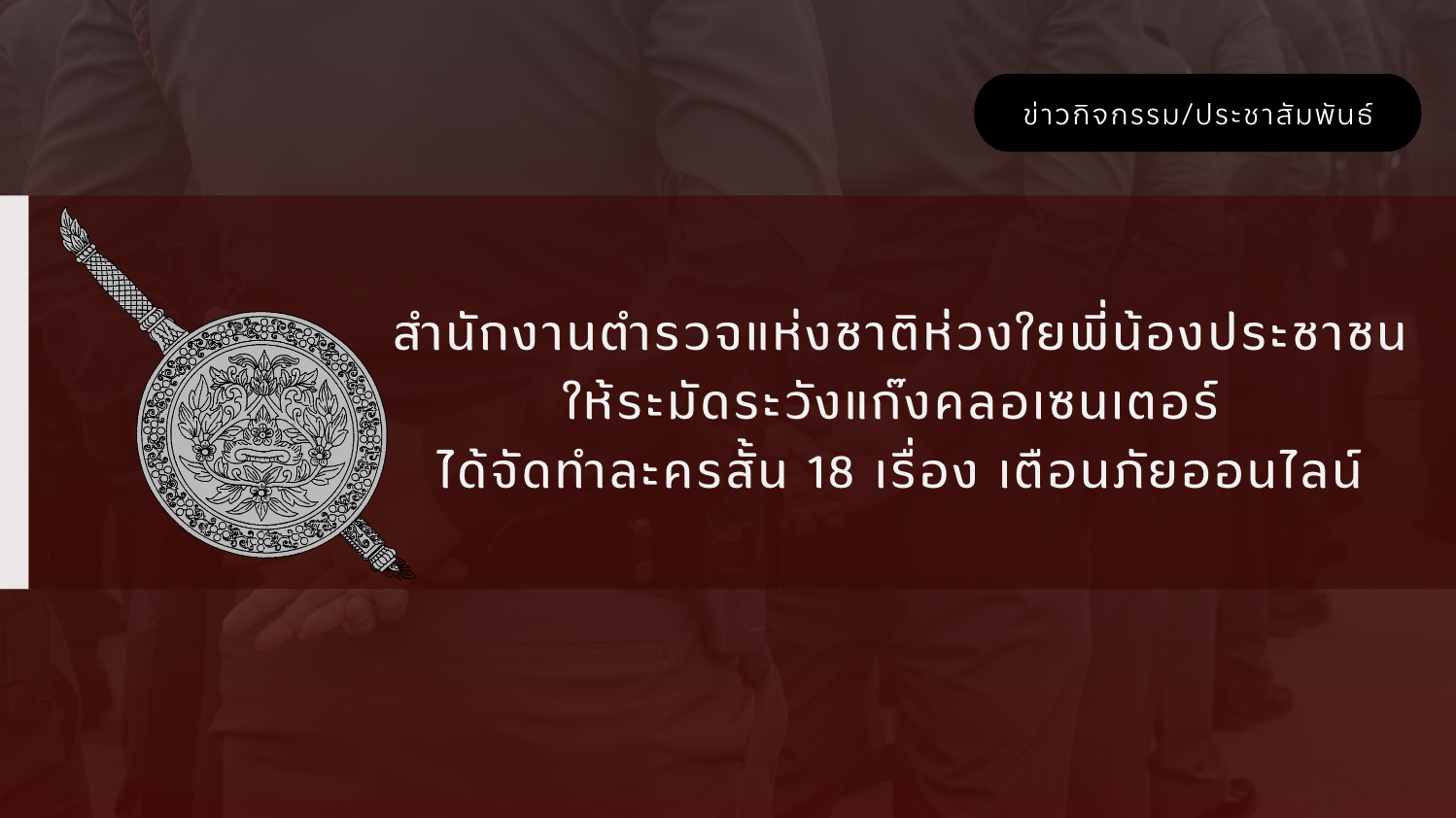 สำนักงานตำรวจแห่งชาติ ห่วงใยพี่น้องประชาชนให้ระมัดระวังแก๊งคลอเซนเตอร์ ได้จัดทำละครสั้น 18 เรื่อง เตือนภัยออนไลน์15 มิถุนายน 2024 สำนักงานตำรวจแห่งชาติ ห่วงใยพี่น้องประชาชนให้ระมัดระวัง &hel...อ่านต่อ >>