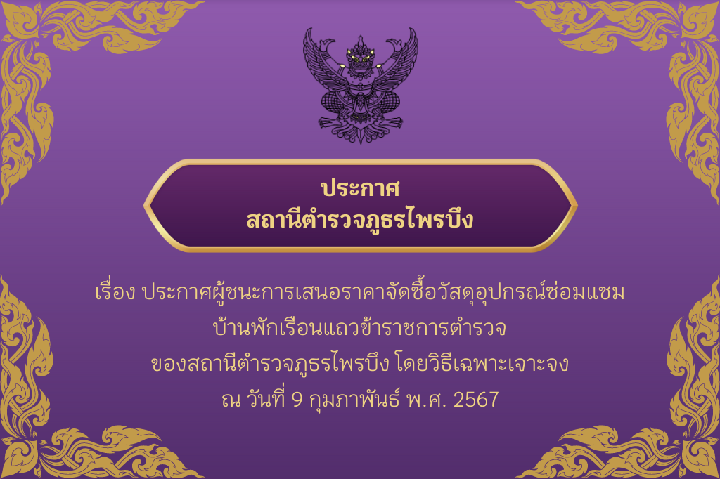 ประกาศผู้ชนะการเสนอราคาจัดซื้อวัสดุอุปกรณ์ซ่อมแซมบ้านพักเรือนแถวข้าราชการตำรวจ ของสถานีตำรวจภูธรไพรบึง ณ วันที่ 9 กุมภาพันธ์ พ.ศ. 256718 เมษายน 2024 ประกาศผู้ชนะการเสนอราคาจัดซื้อวัสดุอุปกรณ์ซ่อมแซมบ้านพั &hel...อ่านต่อ >>